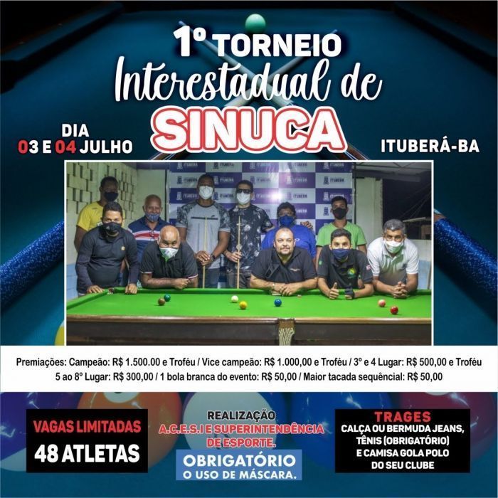 Continue LendoSerá realizado na ACESI - Associação Esportiva Cultural Social de Ituberá, o evento contará com 48 atletas e será realizado nos dias 03 e 04 de Julho, vá TORNEIO INTERESTADUAL *ITUBERÁ* DATA; *03/04 DE JULHO DE 2021* LISTA DE PRESENÇA, PARA OS PRIMEIROS 48 INSCRITOS PAGOS! - VALOR DA INSCRIÇÃO: 100,00 *A LISTA É SO REPRESENTATIVA, SERÁ GARANTIDO AS VAGAS AOS PRIMEIROS 48 PAGANTES* *EVENTO FECHADO COM NOVO REGULAMENTO LEIAM E TIREM SUAS DÚVIDAS* 1 ALEF - ITUBERÁ